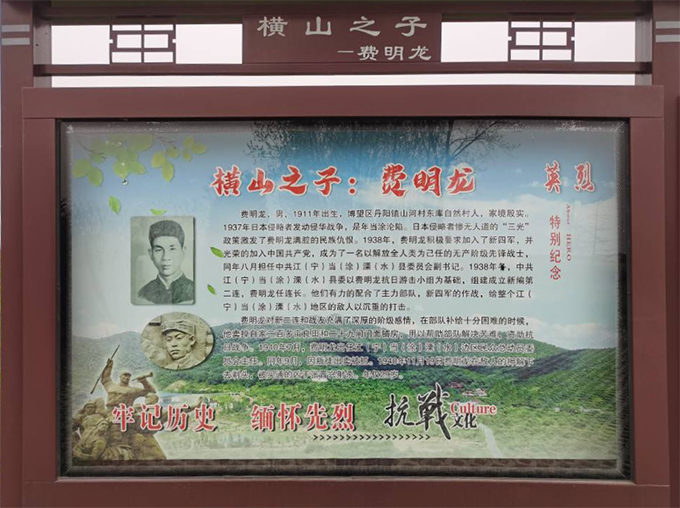横山事件后,横山地区再次陷入白色恐怖中,伪军到处搜捕、杀害我地下党员和抗日志士。为了迅速恢复横山地区的抗日活动,费明龙受上级党组织派遣,与江当溧句中心县委组织部长汪大铭,于9月30日夜间步行来到横山脚下的山西地区。他将汪大铭安排在亲戚家隐蔽下来后,带着通讯员戴金山回到东库村家中。母亲看到儿子回来,声泪俱下,拉着他的衣袖,跪倒在他面前说:“现在到处捉拿你,这次回家就躲起来吧,不要再离开家了,儿呀┄┄”。费明龙同志果断地说:“家难国难不能两全,保国才能保家,妈妈,请原谅我顾不了家了┄┄。”