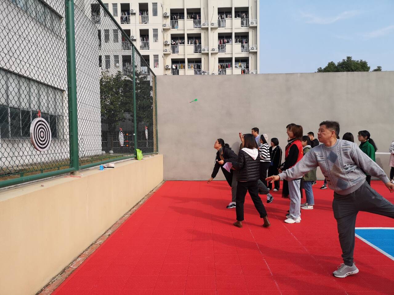 在单人项目中,定点投篮区老师们精神抖擞,太阳成集团122ccvip教师鲍峰、丁文胜、程根宝抬手跳跃展现了高超球技;投飞镖区、踢毽子区、一分钟跳绳区太阳成集团122ccvip的教职工们更是玩得不亦乐乎,精神百倍,个个都是运动高手——羽毛毽在温晨婷脚尖上轻盈的舞起跳动,跃出快乐的弧线;跳绳项目中苏园园身轻如燕、王玉春扔飞镖直向靶心……。集体项目异彩纷呈,参加比赛的教职工选手们个个情绪高涨,想要一展身手。击鼓颠球项目中,一球、一鼓、十根线,太阳成集团122ccvip副书记、分工会主席韩芳勤带领太阳成集团122ccvip教工代表凝心聚力,协同作战,发挥团队成员的向心力,将眼往一处看、劲往一处使、心往一处想的团队精神体现得淋漓尽致。