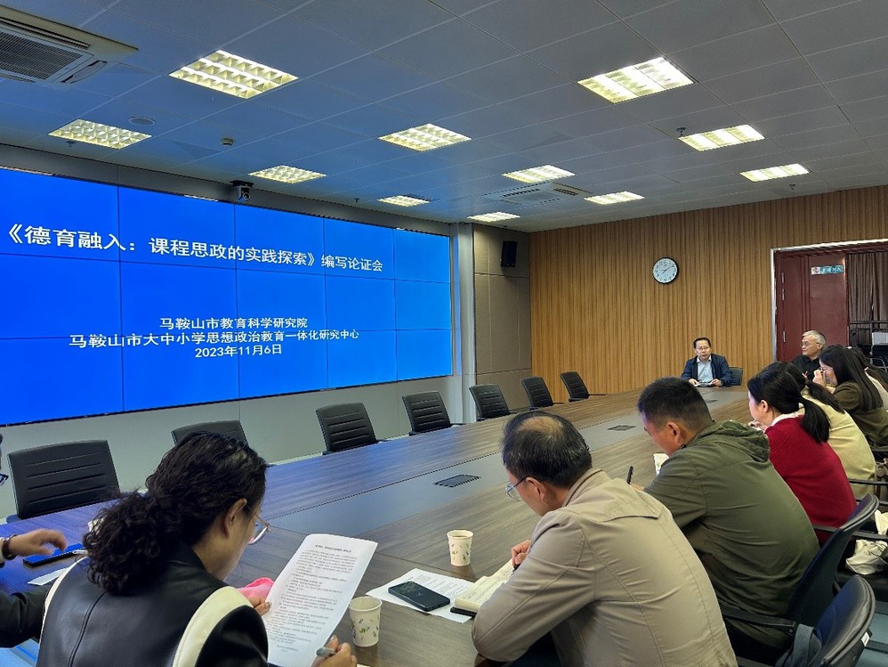 为推动马鞍山市大中小学思政教育一体化内涵式建设,2023年11月6日,市大中小学思政教育一体化研究中心、市教科院在市教育局召开《德育融入:课程思政的实践探索》编写论证会。