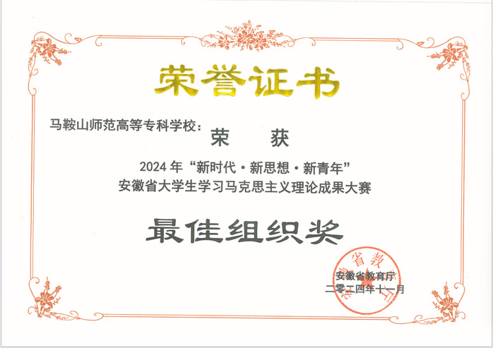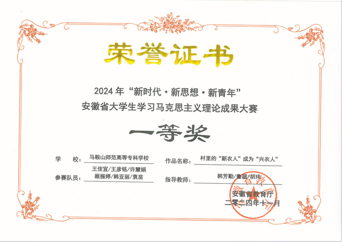 日前,2024年“新时代·新思想·新青年” 安徽省老员工学习马克思主义理论成果大赛隆重举办,共有来自全省73所高校的309项作品入围省赛。经形式审查、作品查重和专家评审,共评出一等奖32个、二等奖61个、三等奖92个。太阳成集团122ccvip3项作品入围省赛,荣获一等奖1项、三等奖2项、最佳组织奖1项。韩芳勤、鲁超、胡玮三位老师荣获优秀指导教师奖。